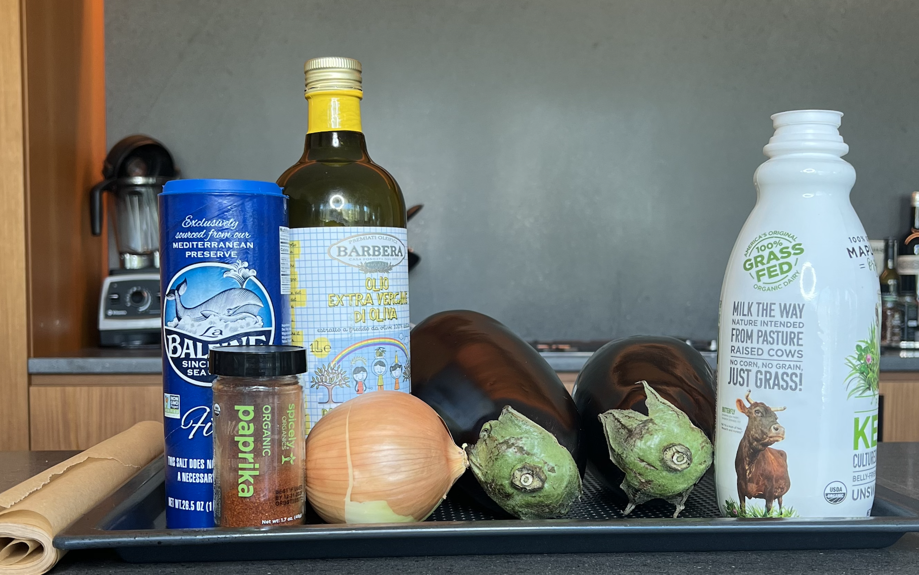 Ingredients: 2 large eggplants, ½ onion, olive oil, salt, kefir OR tahini, spices (I use: smoked paprika, but you can use whatever you like)